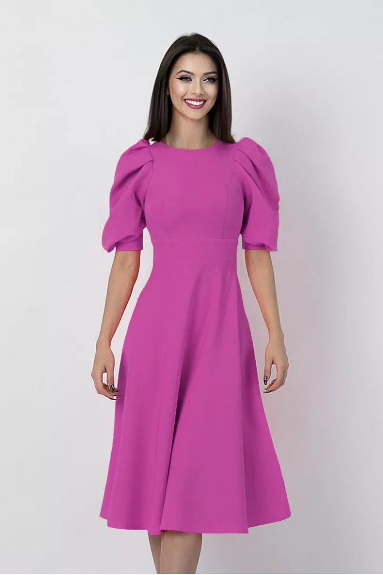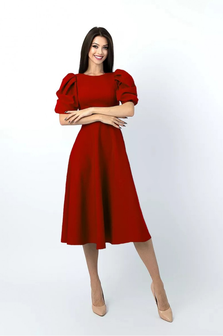Коктейльное платье Алёна привлекает своей простотой и элегантностью. Идеально сидящий закрытый лиф, втачной пояс, обхватывающий талию, юбка-полусолнце длины миди создают образ почти строгий. Но изящные, легкомысленные рукава-фонарики и сочный. праздничный цвет платья делают наряд универсальным. В зависимости от макияжа, бижутерии и обуви это платье уместно на вечеринке или занятиях в колледже, на деловой встрече либ на корпоративе или свадьбе подружки.