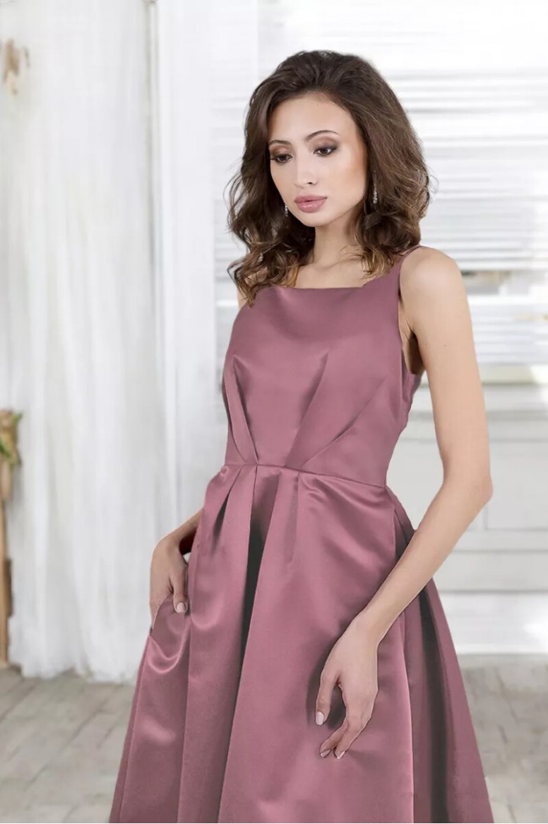 Вечернее платье Фрейя - лаконичное, почти строгое, сразу же полюбилось многим девушкам. Сшитое из матового благородного атласа, имеет необычный крой и актуальную длину миди. У платья есть внутренние карманы в боковых швах, что также привлекает. Лиф на тонких изящных бретелях, красиво открывает зону плеч и шеи. С различными аксессуарами - в зависимости от торжественности мероприятия - это платье будет уместно практически на любом торжестве.