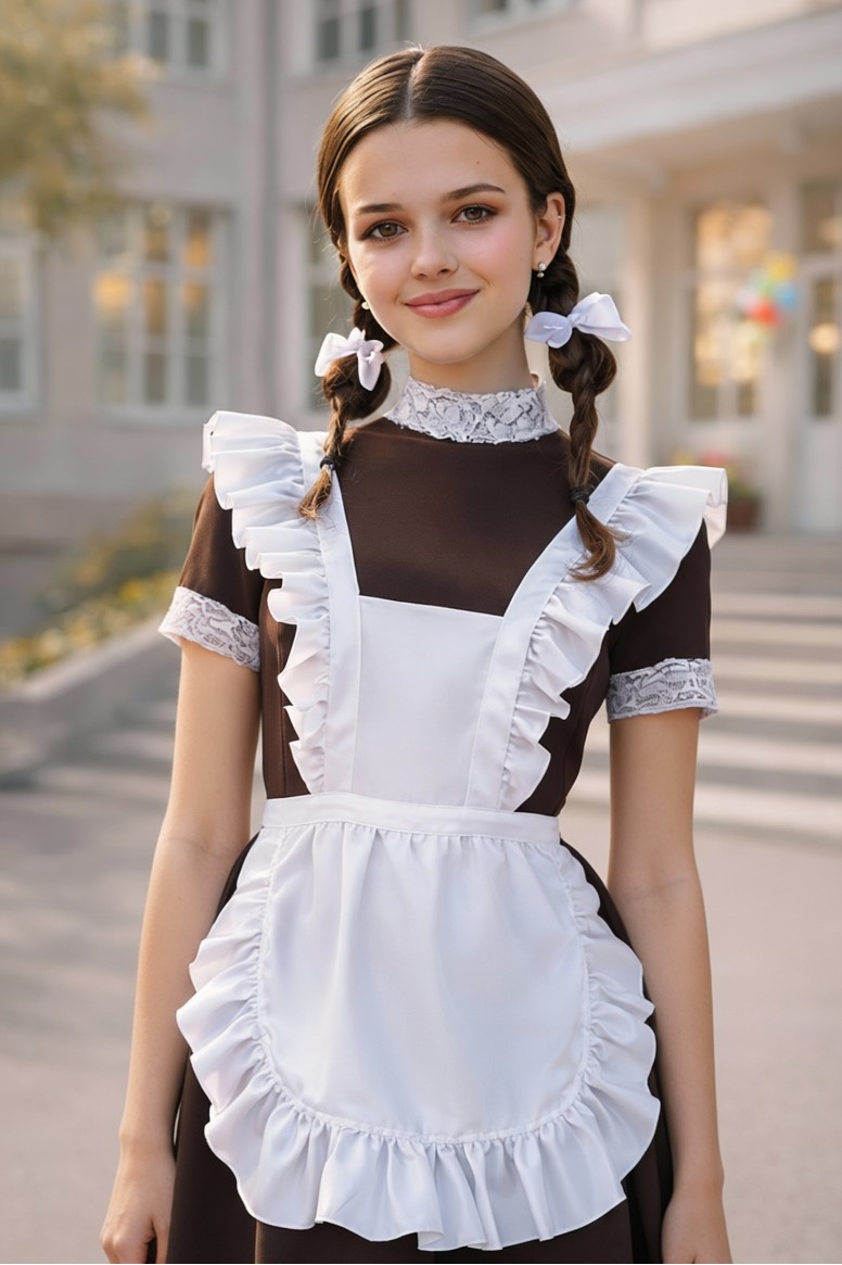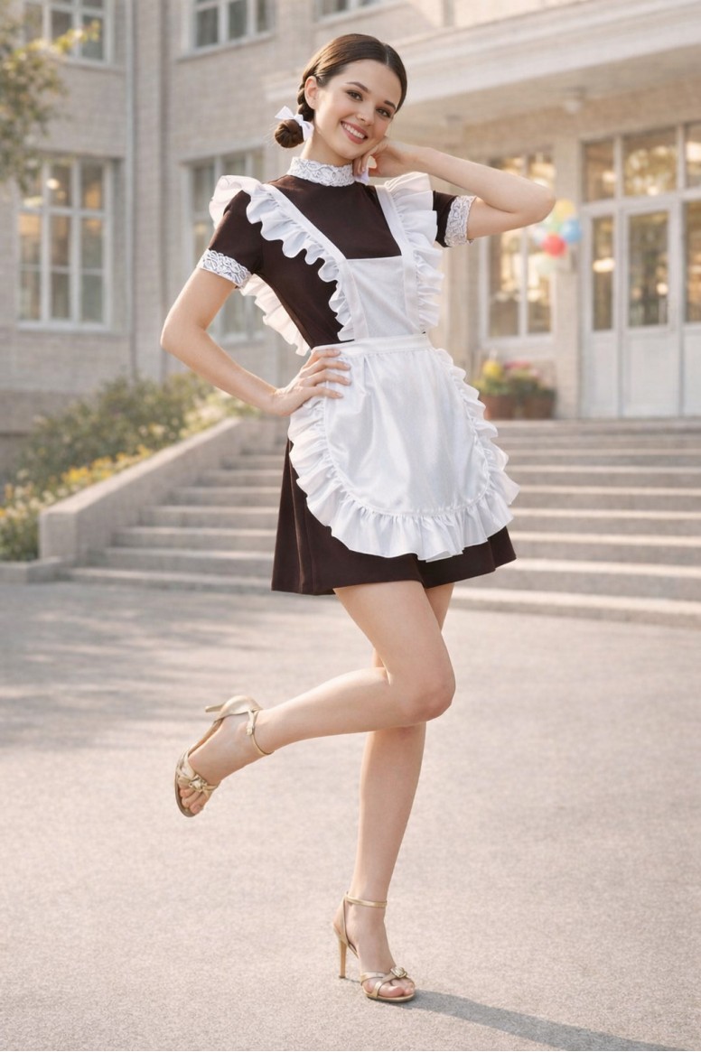 Эта модель комплектуется коричневым (синим, черным) платьем с воротником стойка и фартуком из атласа. Гипюровые манжеты и воротник пришиты к изделию. Короткие рукава. Платье застегивается на потайную молнию сзади. Юбка фасона трапеция — это самая универсальная модель, которая подойдет для любого типа фигуры. Фартук выполнен с круговой оборкой, подчеркивающей девичью красоту и делающий образ очень выразительным.