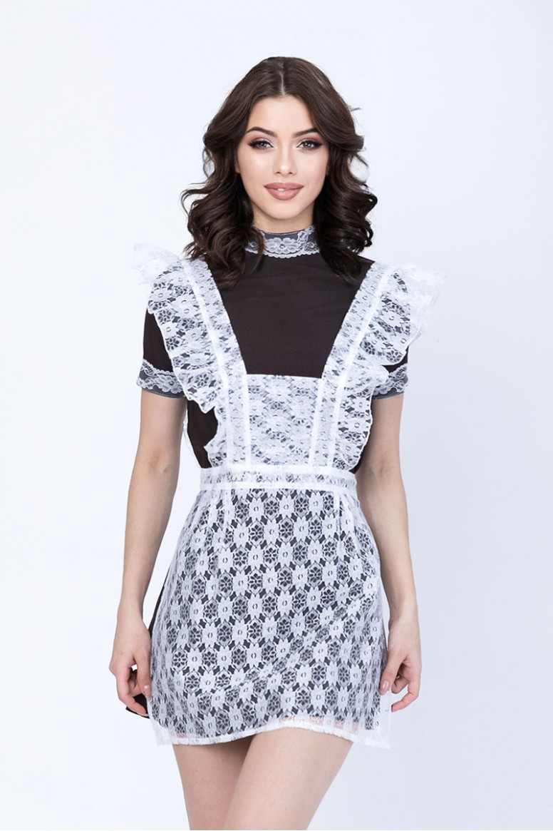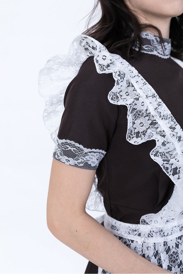 Элегантная школьная форма в классическом ретро-стиле Гармония - тёмное платье с декоративным белым кружевным фартуком и эффектными кружевными оборками на плечах и воротнике. Аккуратный приталенный силуэт и продуманная посадка обеспечивают стильный внешний вид и комфорт в течение дня. Фартук выполнен из лёгкого ажурного кружева, подчёркивающего торжественность образа; платье - из прочной, легко ухаживаемой ткани, подходящей для повседневной носки и праздничных мероприятий. Идеальный вариант для «Первого/Последнего звонка», школьных праздников, концертов и фотосессий.
