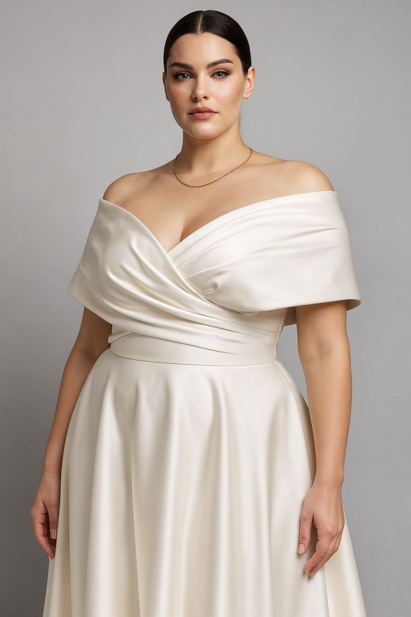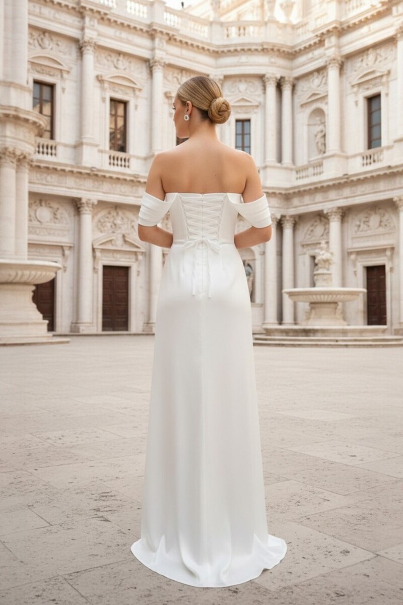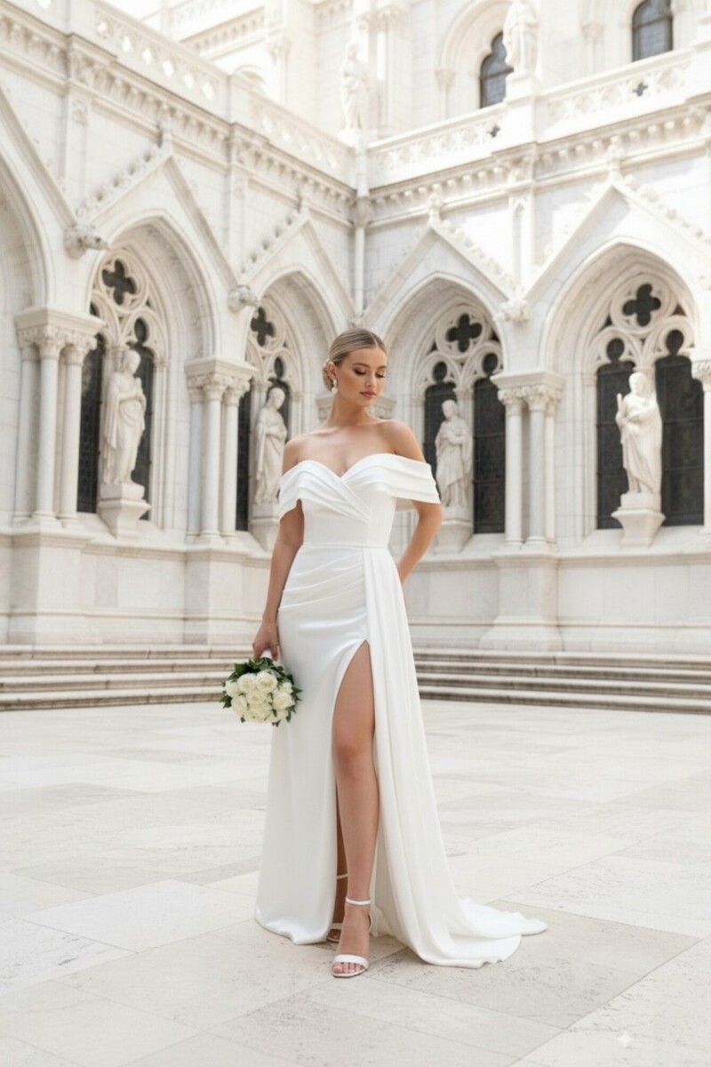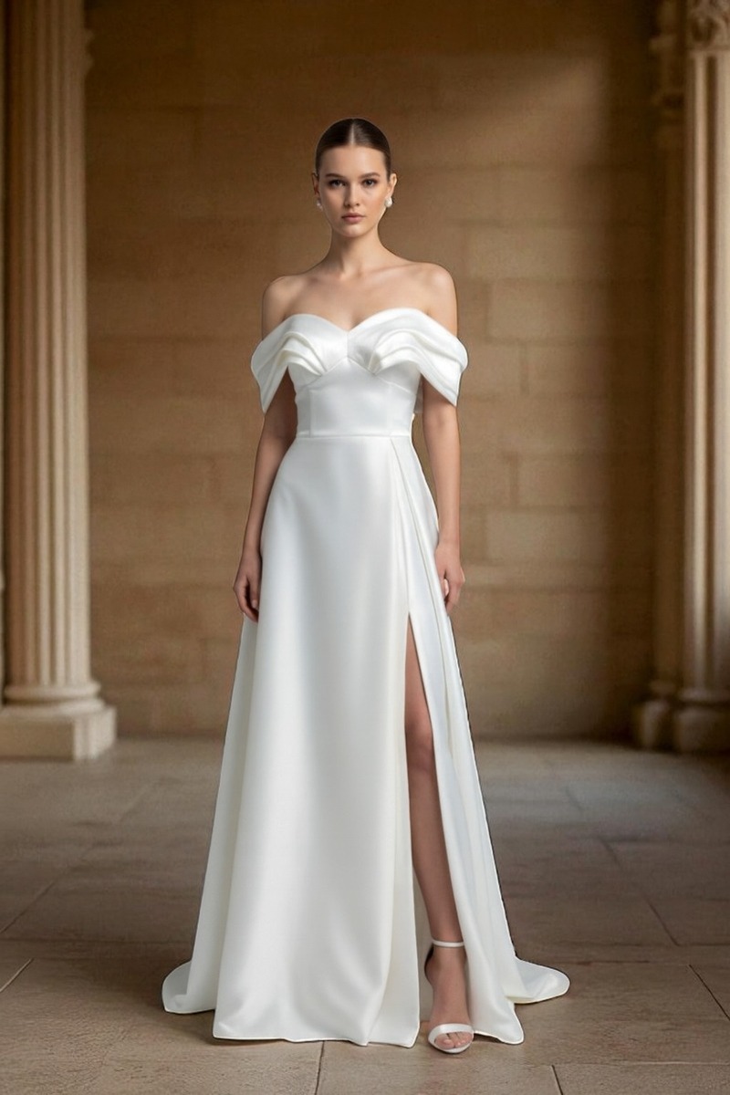 Свадебное платье Ауриэль – это не просто наряд, это заявление о вашем безупречном вкусе и внутренней силе. Это платье в стиле «офф-шолдер» с глубоким драпированным лифом, который мягко обрамляет плечи и декольте, создавая эффектную и романтичную линию. Облегающий пояс акцентирует талию, смелый разрез по бедру добавляет образу нотку сексуальности и динамики, позволяя вам двигаться с грацией и уверенностью.
