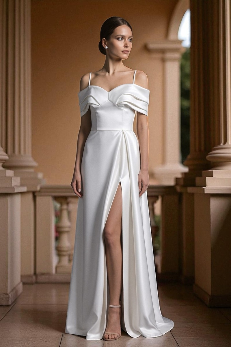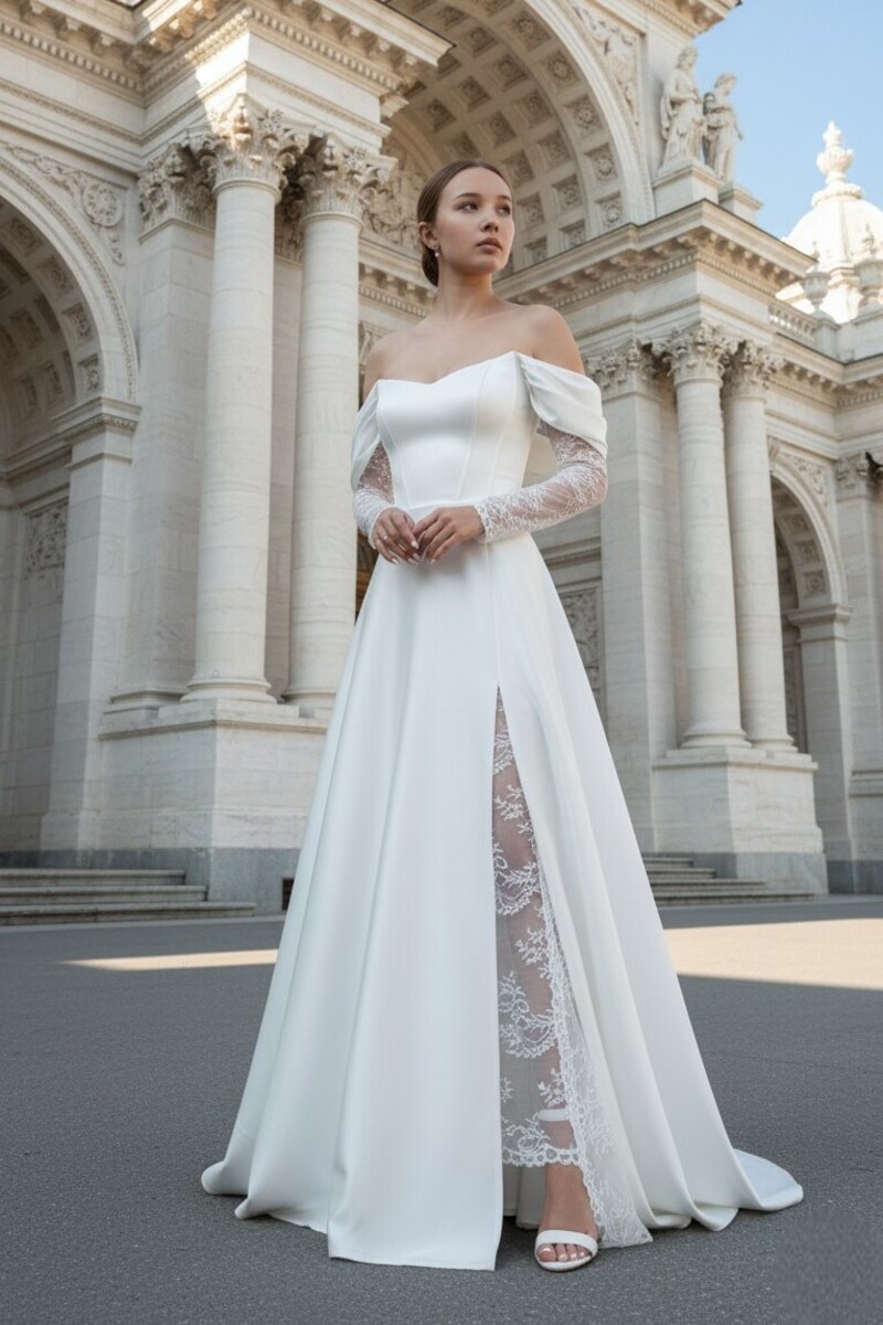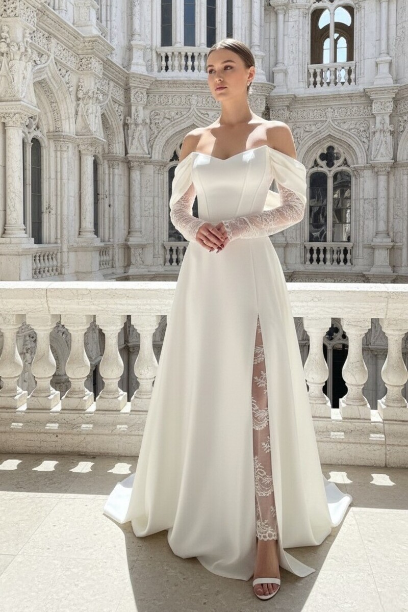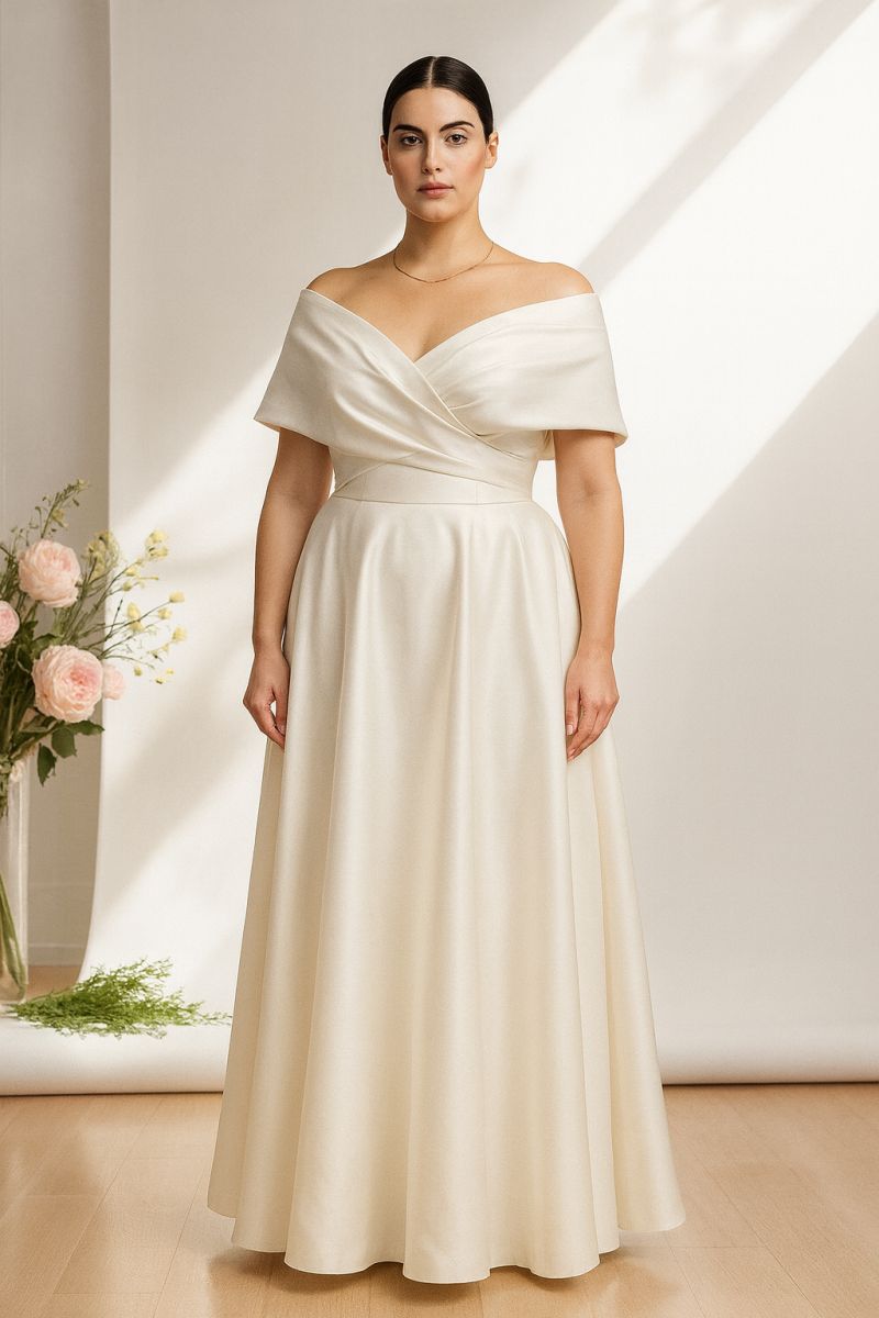 Свадебное платье Ауриэль – это не просто наряд, это заявление о вашем безупречном вкусе и внутренней силе. Это платье в стиле «офф-шолдер» с глубоким драпированным лифом, который мягко обрамляет плечи и декольте, создавая эффектную и романтичную линию. Облегающий пояс акцентирует талию, смелый разрез по бедру добавляет образу нотку сексуальности и динамики, позволяя вам двигаться с грацией и уверенностью.